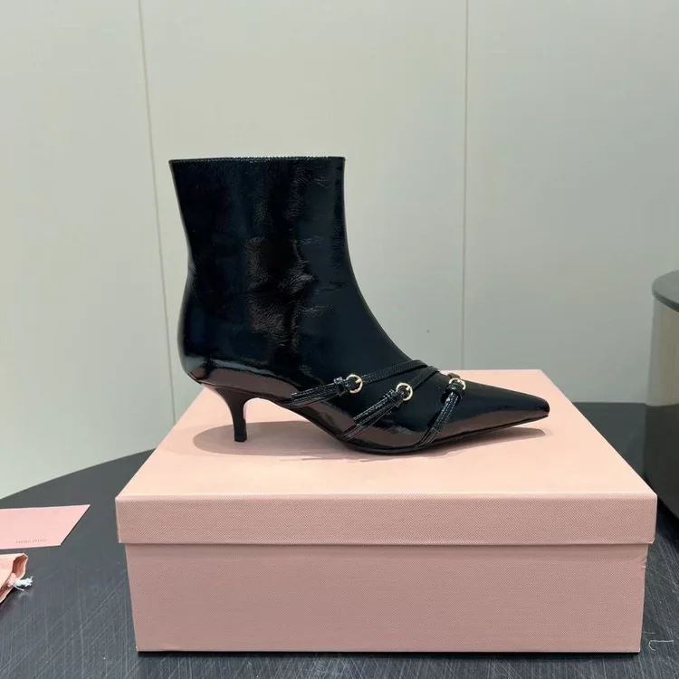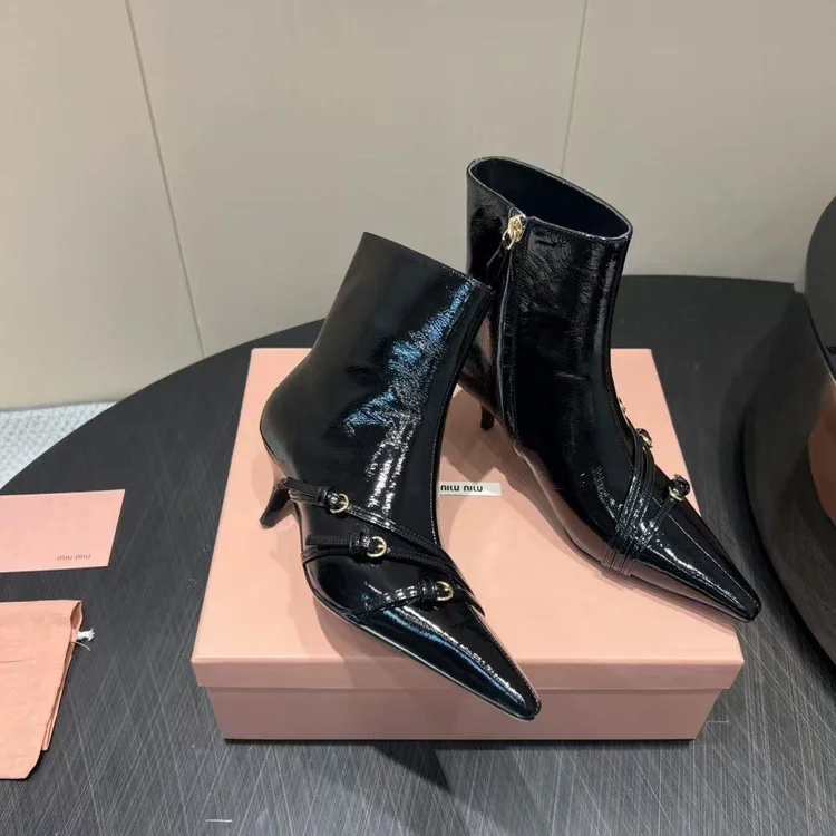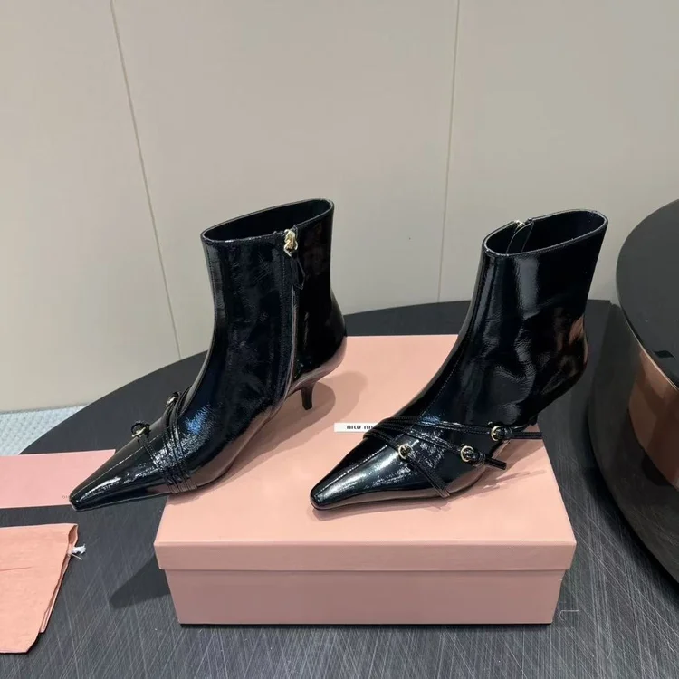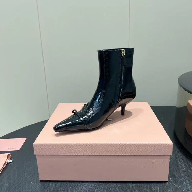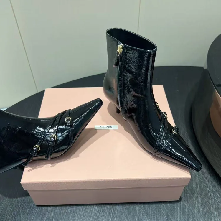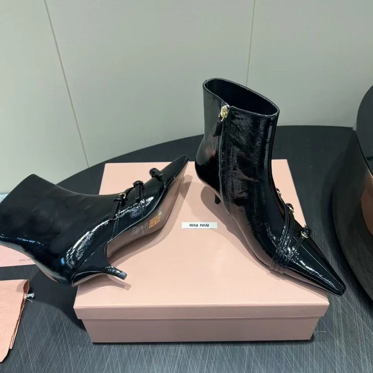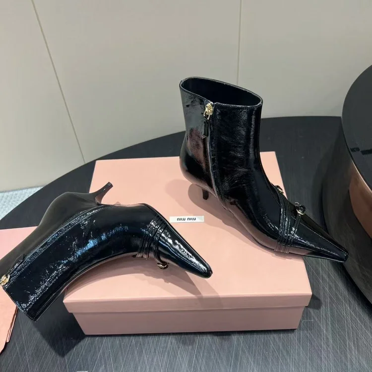Miumiu MiuMiu Pointed-toe High-heeled Ankle Boots embodies luxury craftsmanship and the signature elegance of its maison. The silhouette is designed to balance style with comfort, perfect for city wear or elevated occasions. Attention to detail is evident in its stitching, finish, and timeless design ethos. A versatile statement piece, it transitions effortlessly from daywear to evening sophistication.