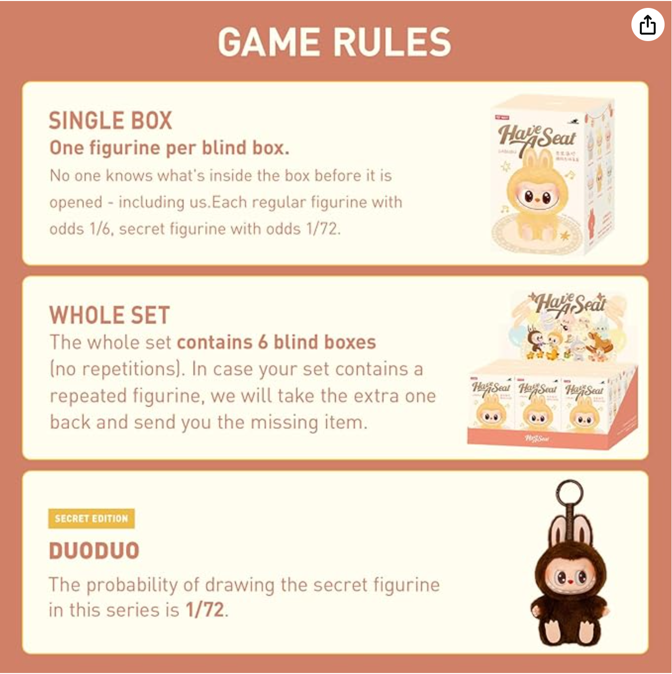 - Random Design: Blind boxes are fully random and we cannot accept requests for specific items. There chances of getting the secret edition are usually 1/72. When purchasing the whole set, there will be no duplicates figures.